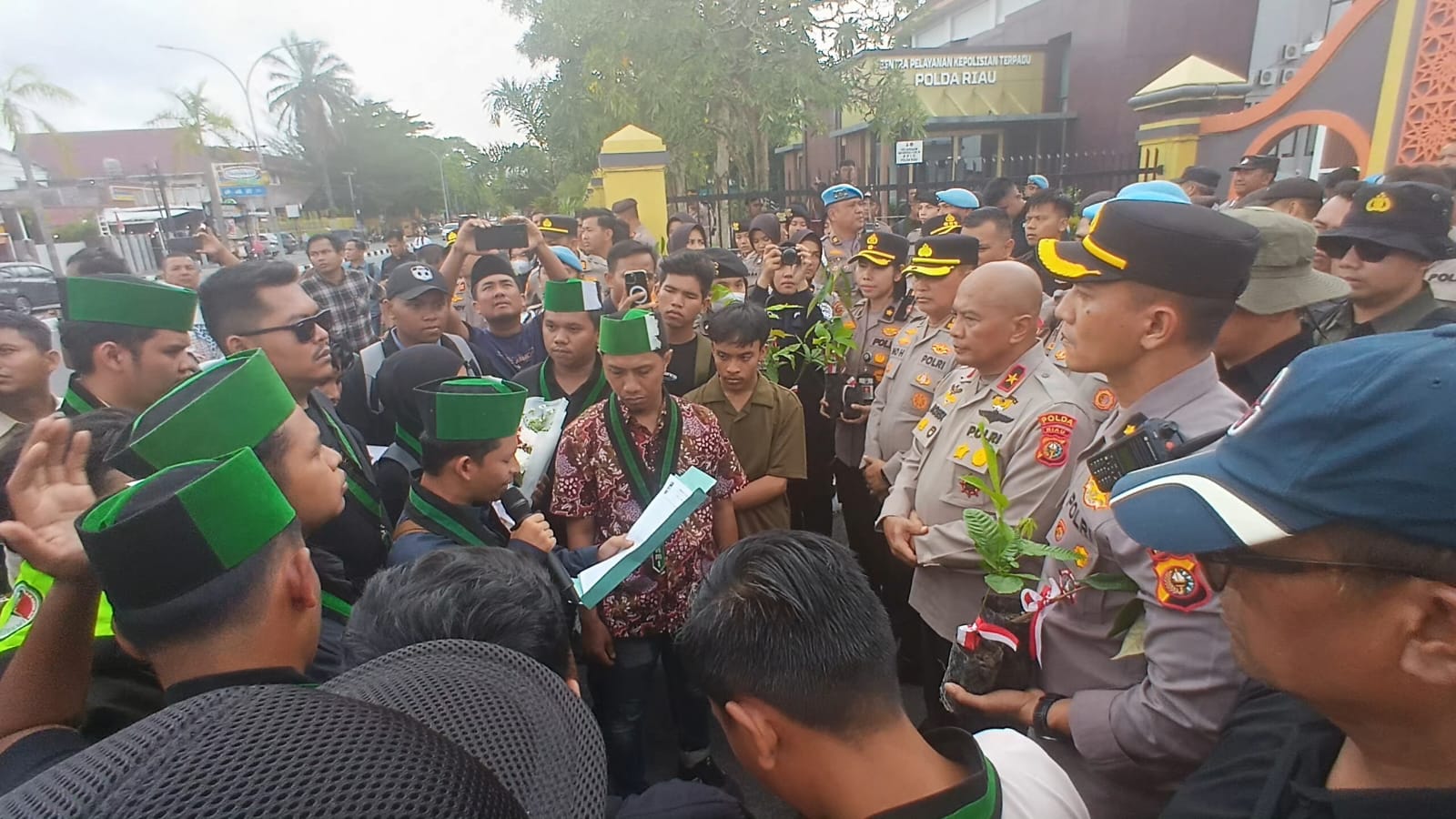 Dalam aksi yang berlangsung damai itu, mahasiswa HMI menyampaikan sejumlah tuntutan, antara lain menghapus tunjangan anggota DPR RI dan mendesak agar RUU Perampasan Aset segera disahkan. Demo diakhiri dengan pemberian bibit pohon oleh Polwan Polda Riau kepada massa HMI.