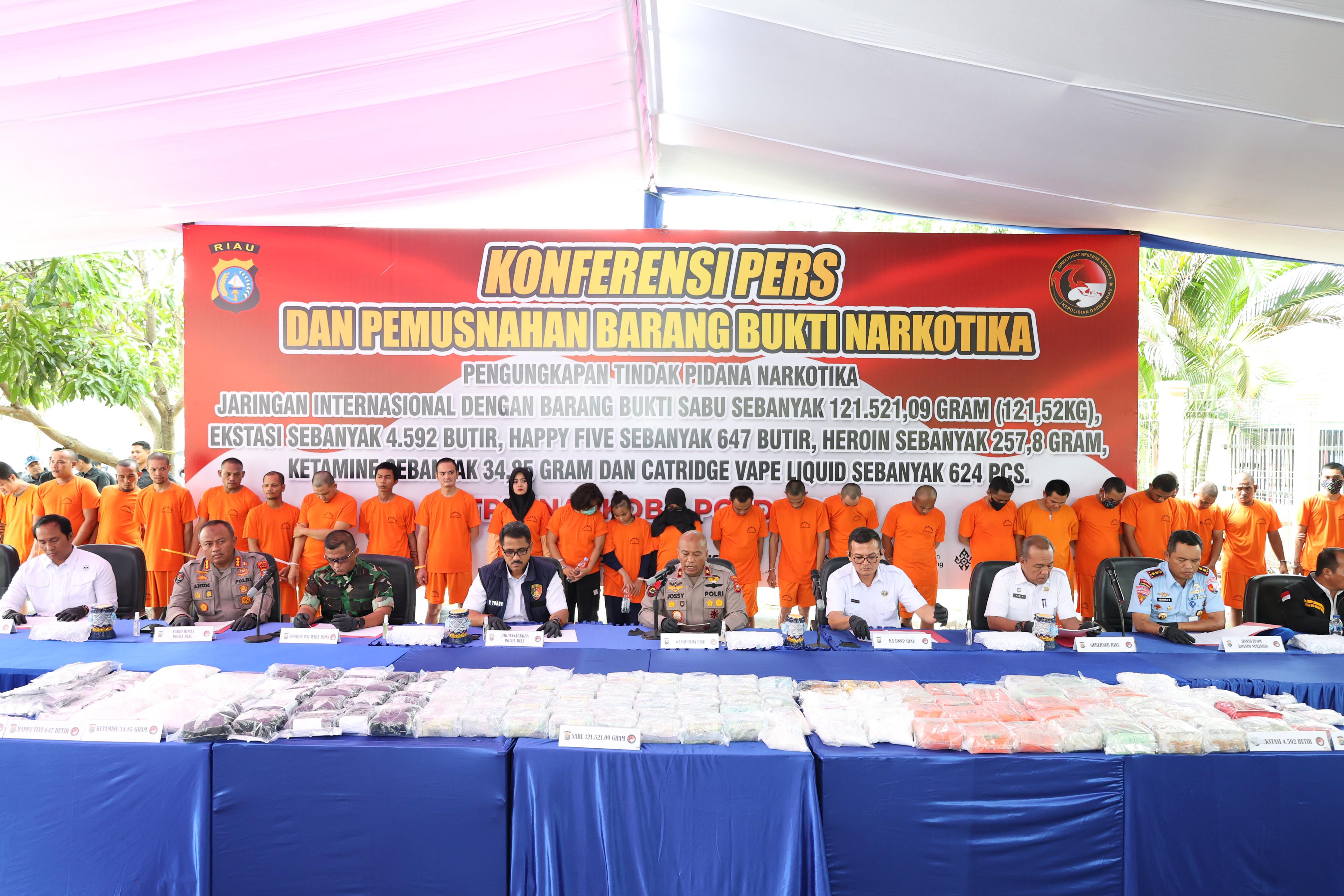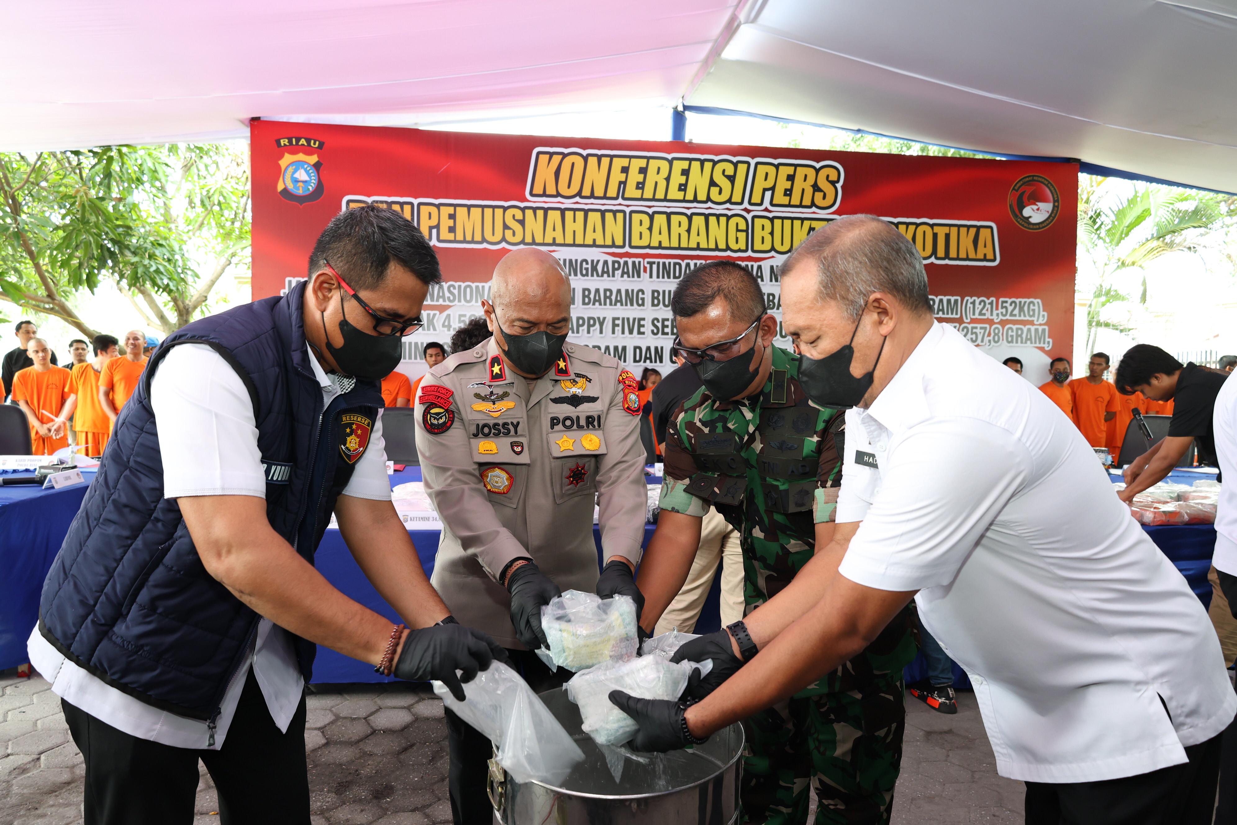 Pekanbaru – Kepolisian Daerah (Polda) Riau memusnahkan narkoba berbagai jenis senilai Rp 123,7 miliar. Narkoba tersebut disita polisi selama 3 bulan operasi.