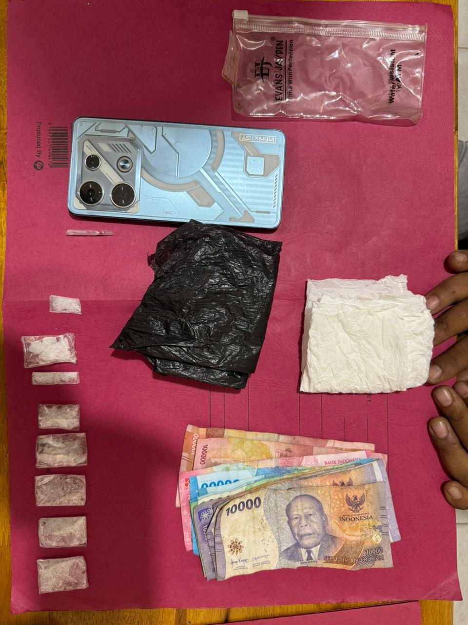 Dari tangan IF, petugas menemukan 1 paket sabu yang dibuang ke tanah. Tidak berhenti di situ, penggeledahan di rumahnya kembali mengungkap 7 paket sabu, serta sejumlah barang bukti lain berupa uang tunai, tisu, plastik, pipet modifikasi, dan 4 unit telepon genggam.
