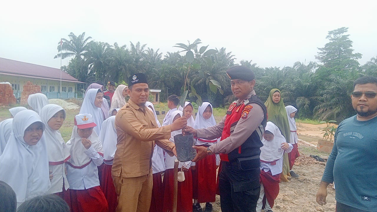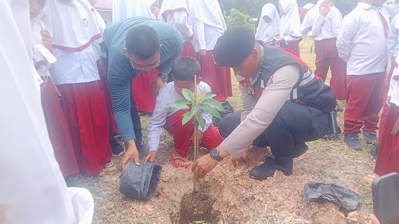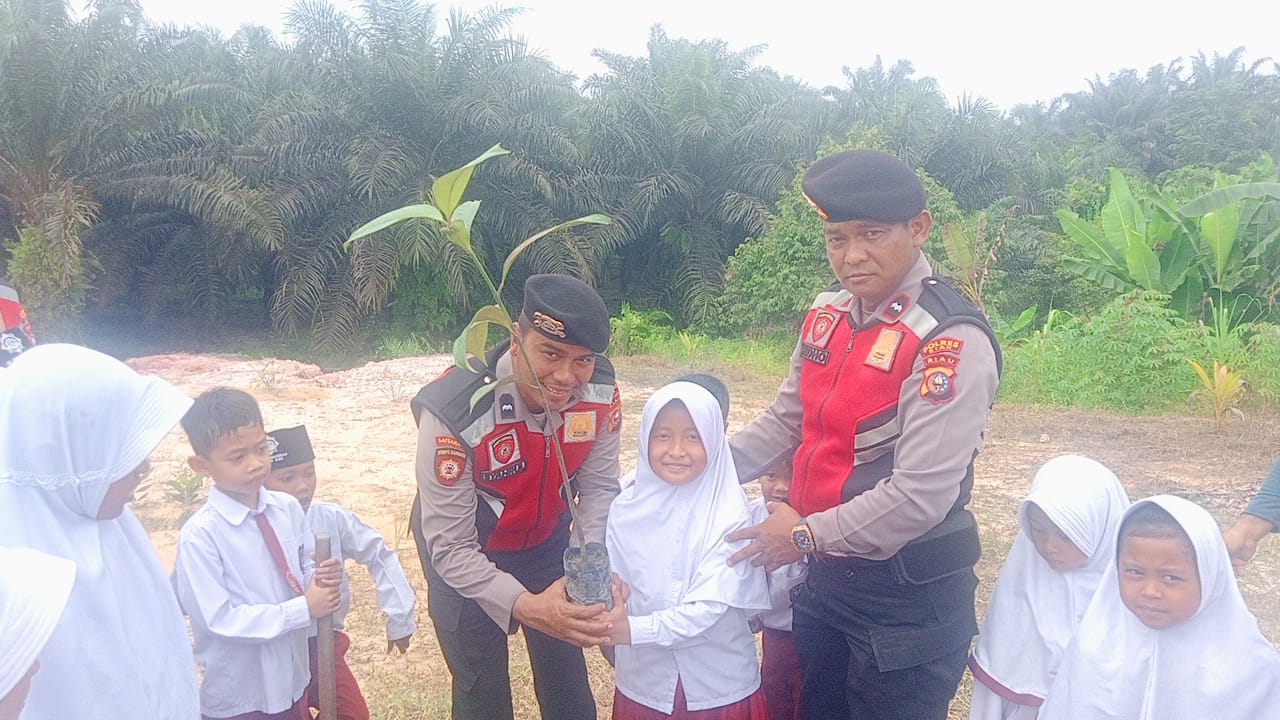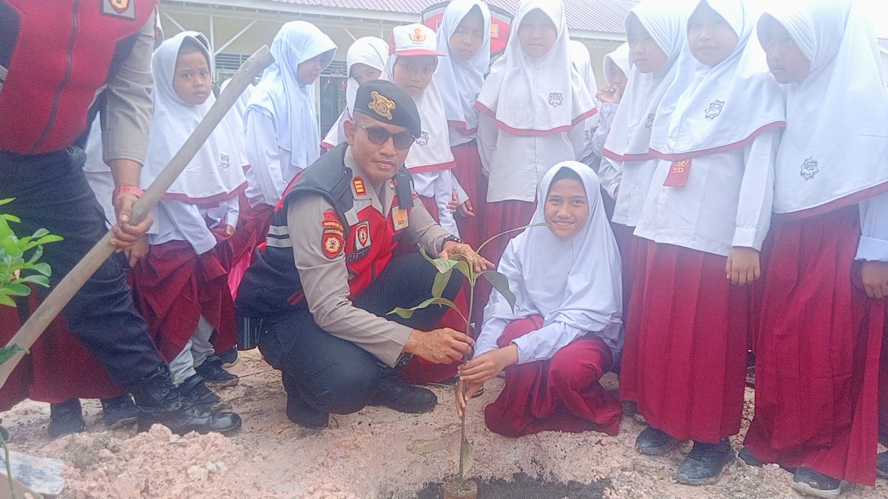 Siak – Dalam rangka mendukung program Green Policing yang digagas Kapolda Riau, jajaran Polres Siak melalui Satuan Samapta melaksanakan kegiatan penanaman bibit pohon di lingkungan SDIT Muthamainnah, Kecamatan Dayun, pada Senin (13/10/2025) pagi.