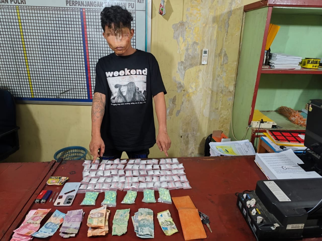 Sesampainya di lokasi, petugas mendapati pelaku telah diamankan oleh warga. Setelah dilakukan pemeriksaan, ditemukan 74 paket plastik bening berisi diduga shabu seberat kotor 395,46 gram, serta 5 kantong berisi total 501 butir pil diduga ekstasi. Selain itu, turut diamankan alat konsumsi, tas, dompet, uang tunai, dan satu unit telepon genggam.