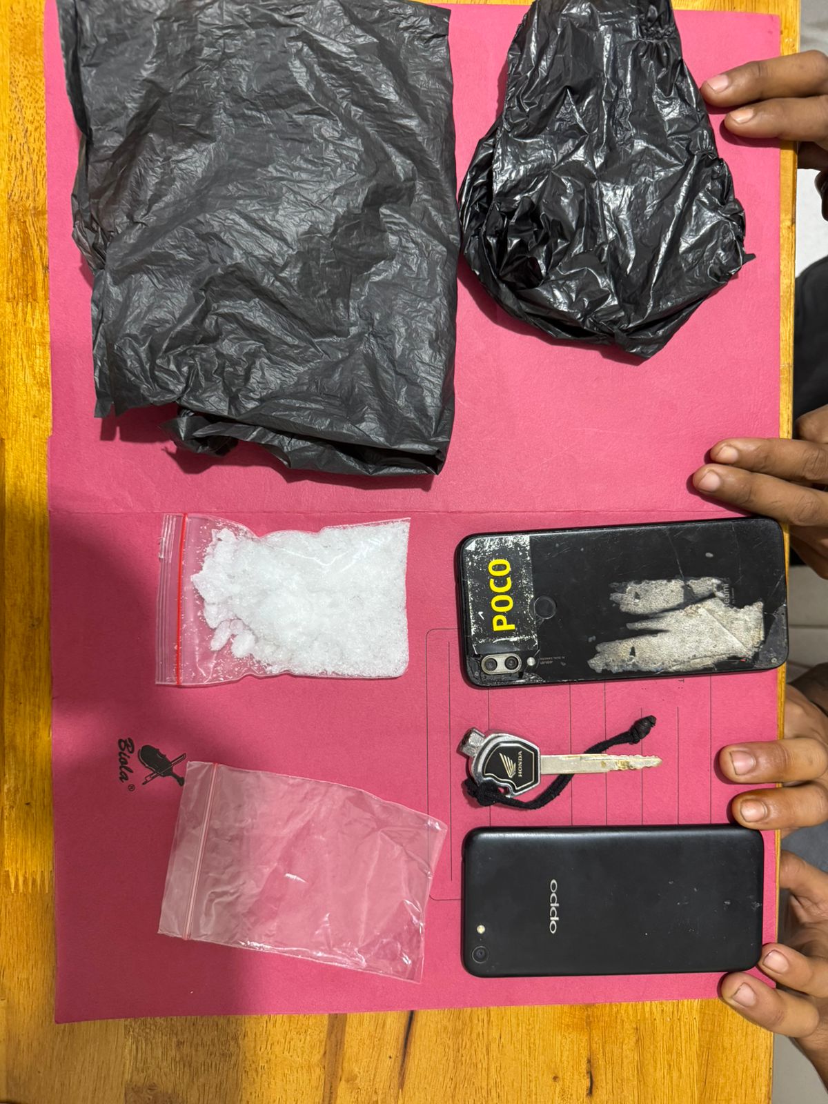 “Sekitar pukul 21.00 WIB, target berhenti di Jalan Perawang–Siak. Tim langsung mengamankan dua orang yang belakangan diketahui berinisial FB dan MAM. Saat dilakukan penggeledahan, ditemukan satu paket narkotika jenis shabu di dalam kantong jaket milik FB,” terang Kasat Narkoba.