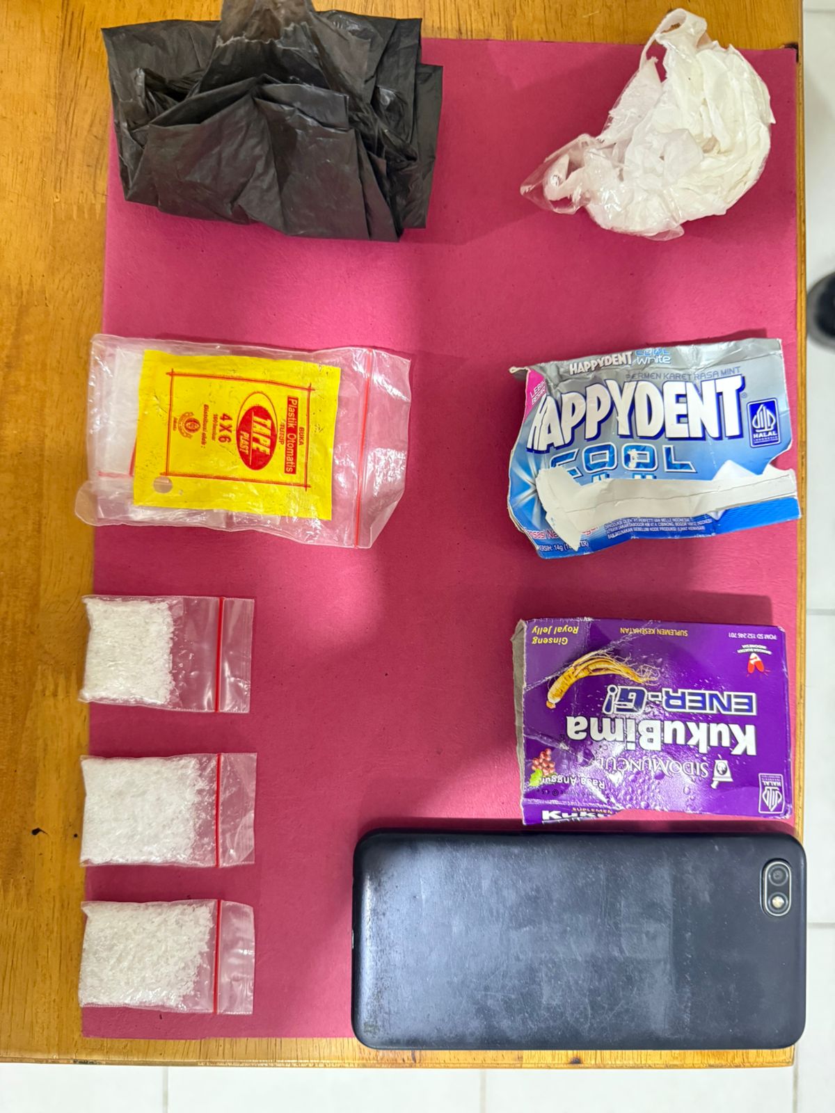 Selain itu, turut diamankan barang bukti lain berupa satu pack plastik klip bening, satu bungkus Happydent, satu bungkus Kukubima, satu plastik warna hitam, serta satu unit ponsel merek Oppo yang diduga digunakan untuk transaksi.