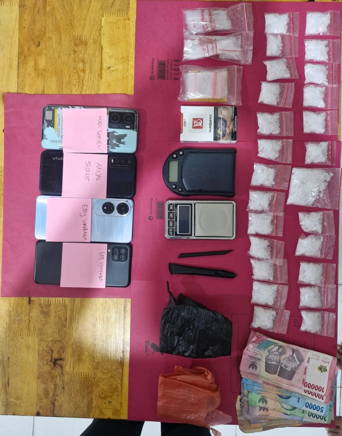 Sekira pukul 17.00 WIB, petugas berhasil mengamankan dua orang tersangka berinisial A.S.S (29) dan A.R.N (28) di sebuah rumah kontrakan di Jalan Sudirman, Telaga Sam-Sam. Saat dilakukan penggeledahan, ditemukan satu paket sabu yang disimpan dalam kotak rokok di saku celana pelaku A.S.S.