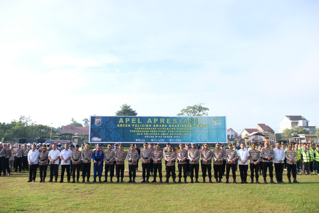 Siak – Prestasi membanggakan kembali ditorehkan oleh jajaran Polres Siak. Bripka Rosady Elian, Bhabinkamtibmas Kelurahan Minas Jaya, berhasil meraih apresiasi dalam ajang Green Policing Award Polda Riau 2025. Penghargaan tersebut diberikan dalam kegiatan Apel Apresiasi Green Policing Award Bhabinkamtibmas, Pelatihan dan Penghargaan Satkamling Terbaik, serta Penyerahan Sertifikat Public Speaking Green Policing Polda Riau yang digelar di halaman Mapolda Riau, Rabu (8/10/2025).